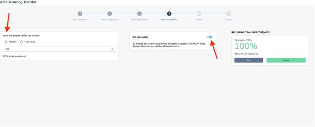 - For the quantity of RECs, select Percent and write in 100. Click the Irrevocable Toggle and hit Review.