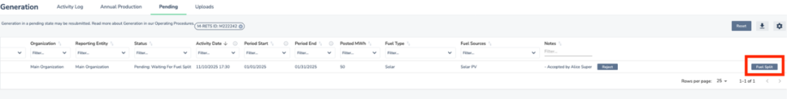 - You will now see the Generation you’ve uploaded under the Pending tab. If the status is Pending: Capacity Feasibility, Waiting for Fuel Split, that means that you would first need to send meter/production data to M-RETS admins for review and manual approval.