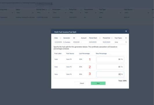 - The Fuel Split window is where you are allocating the RECs for the recipients. Again, the labels are not visible, but the fuels are in the same order as they are under the fuels tab of the generator. So, if ComEd is supposed to receive 30% of the generation write in 30 for the first fuel. If MidAmerican is supposed to receive 40% of the generation write in 40 in the second fuel. And if Ameren is supposed to receive 30% of the generation, write in 30 in the third fuel. You can also always reference to how you allocated the generation previously in the Last Percentage column. Select Save.
