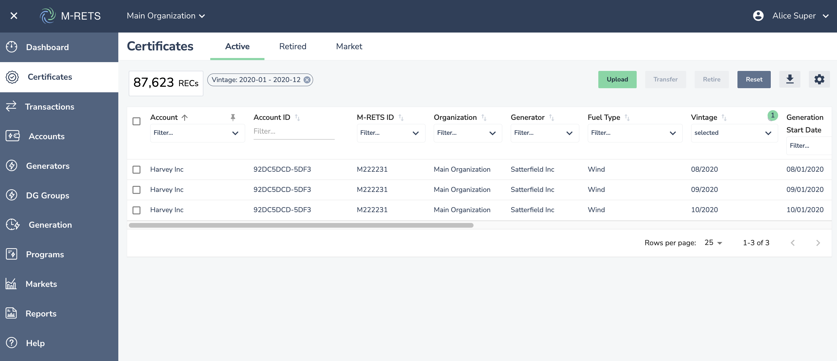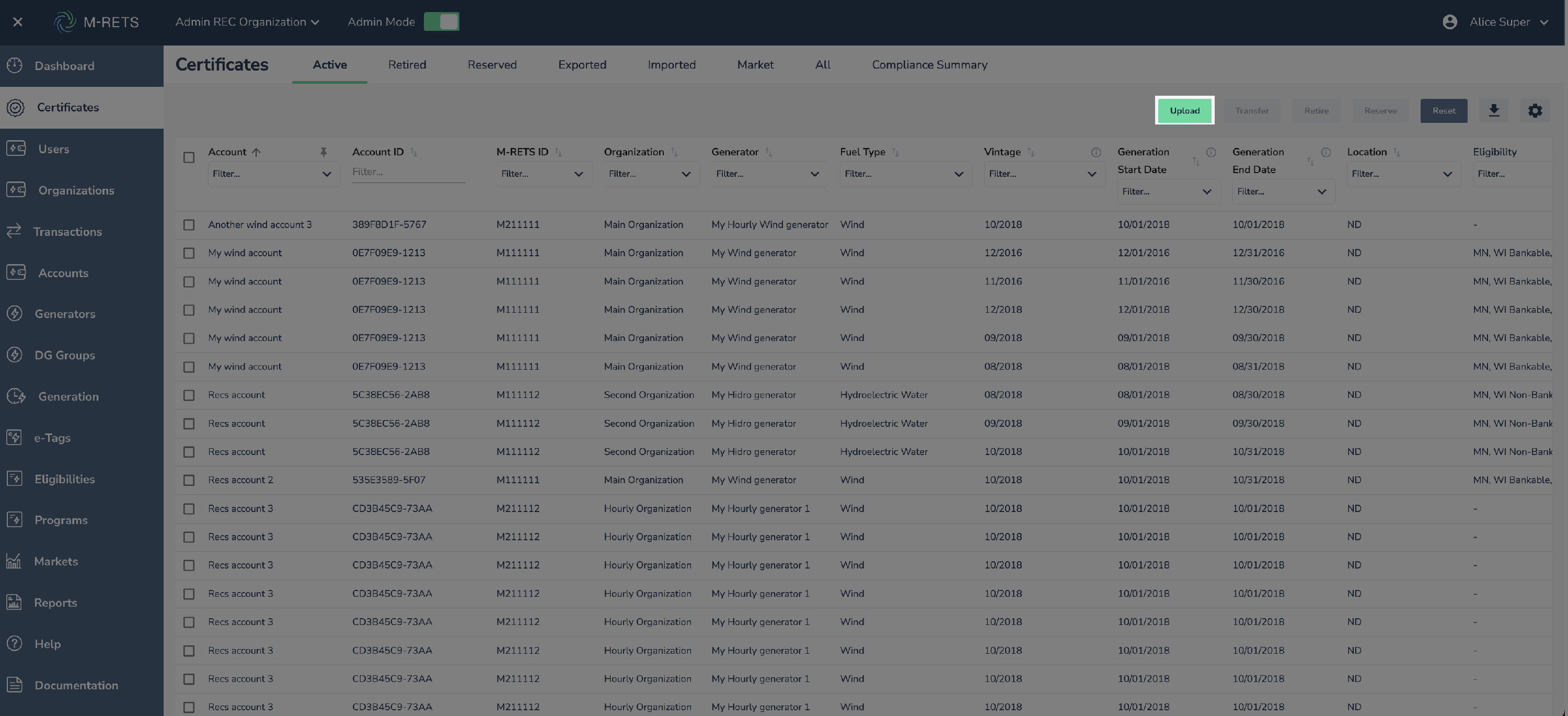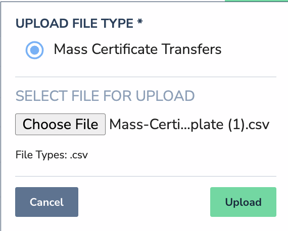 M-RETS allows for the mass transfer of certificates via CSV (.csv file type) to either an internal active account or an external organization.