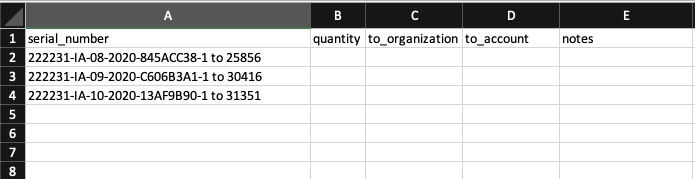 - Column A Using the downloaded "Active Certificates" CSV from step one, copy the serial numbers into the "Mass Certificate Transfers Template".
