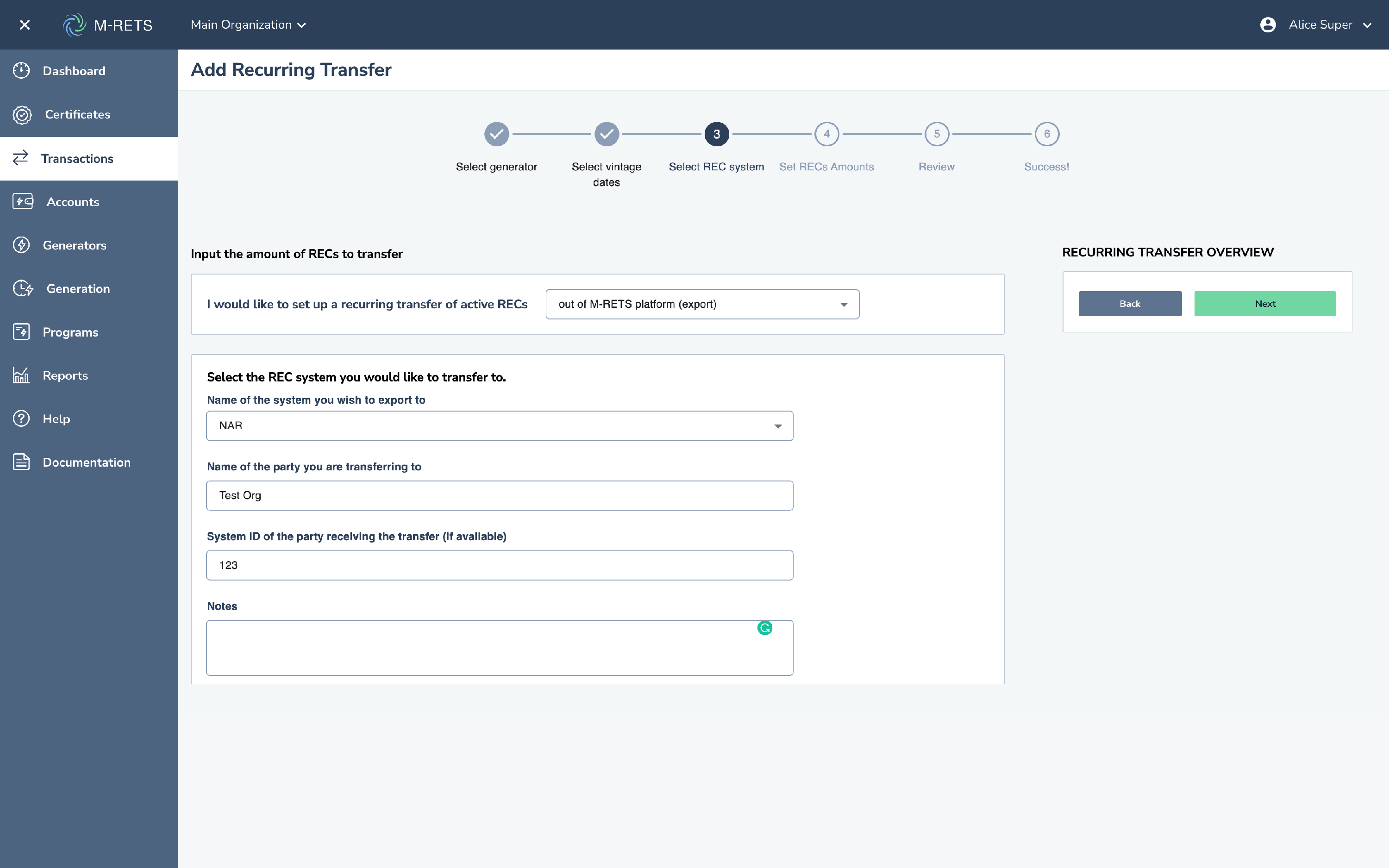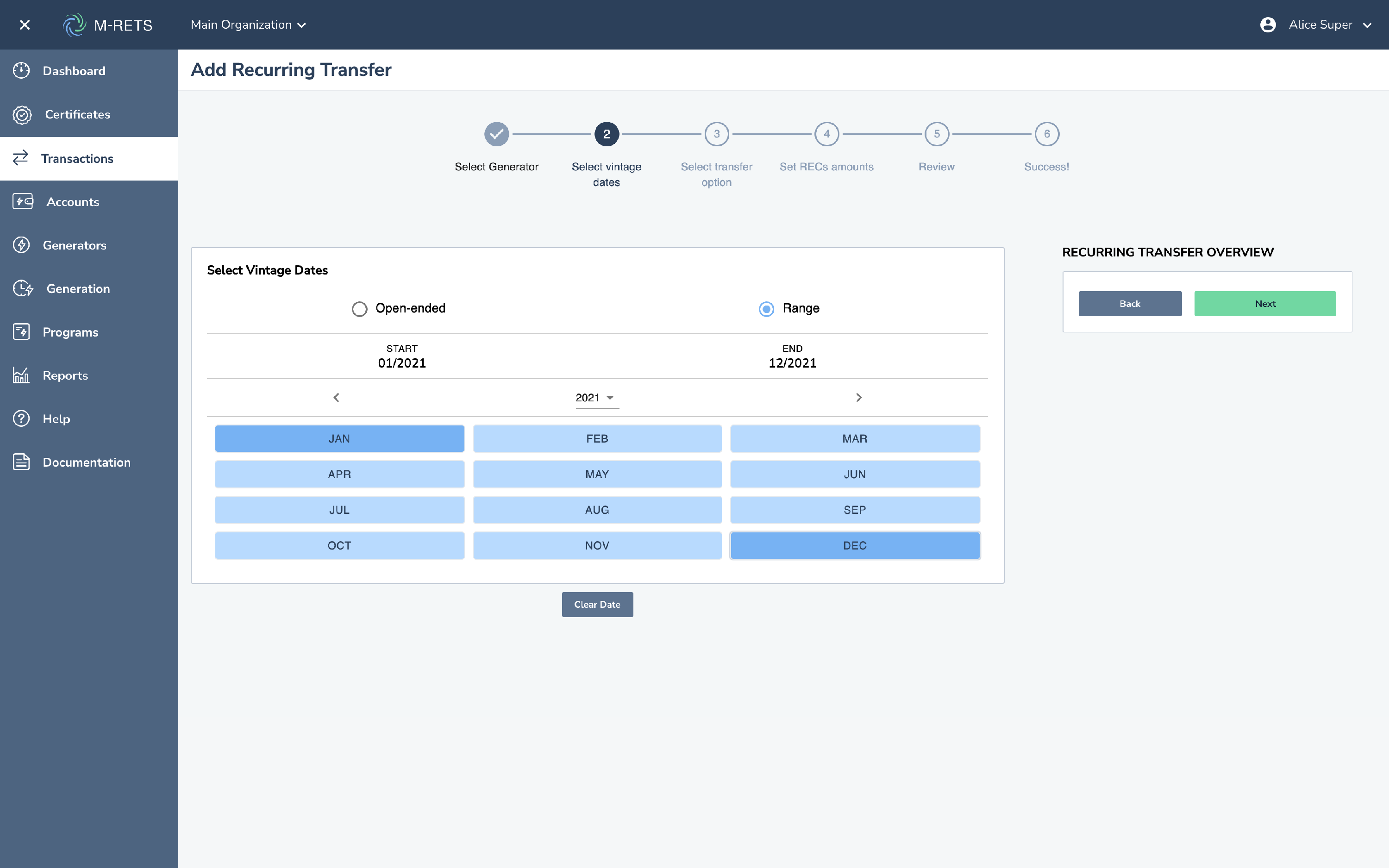 - Select your certificate vintage start date and end date. Your transfer will be sent every month during the calendar timeframe selected.