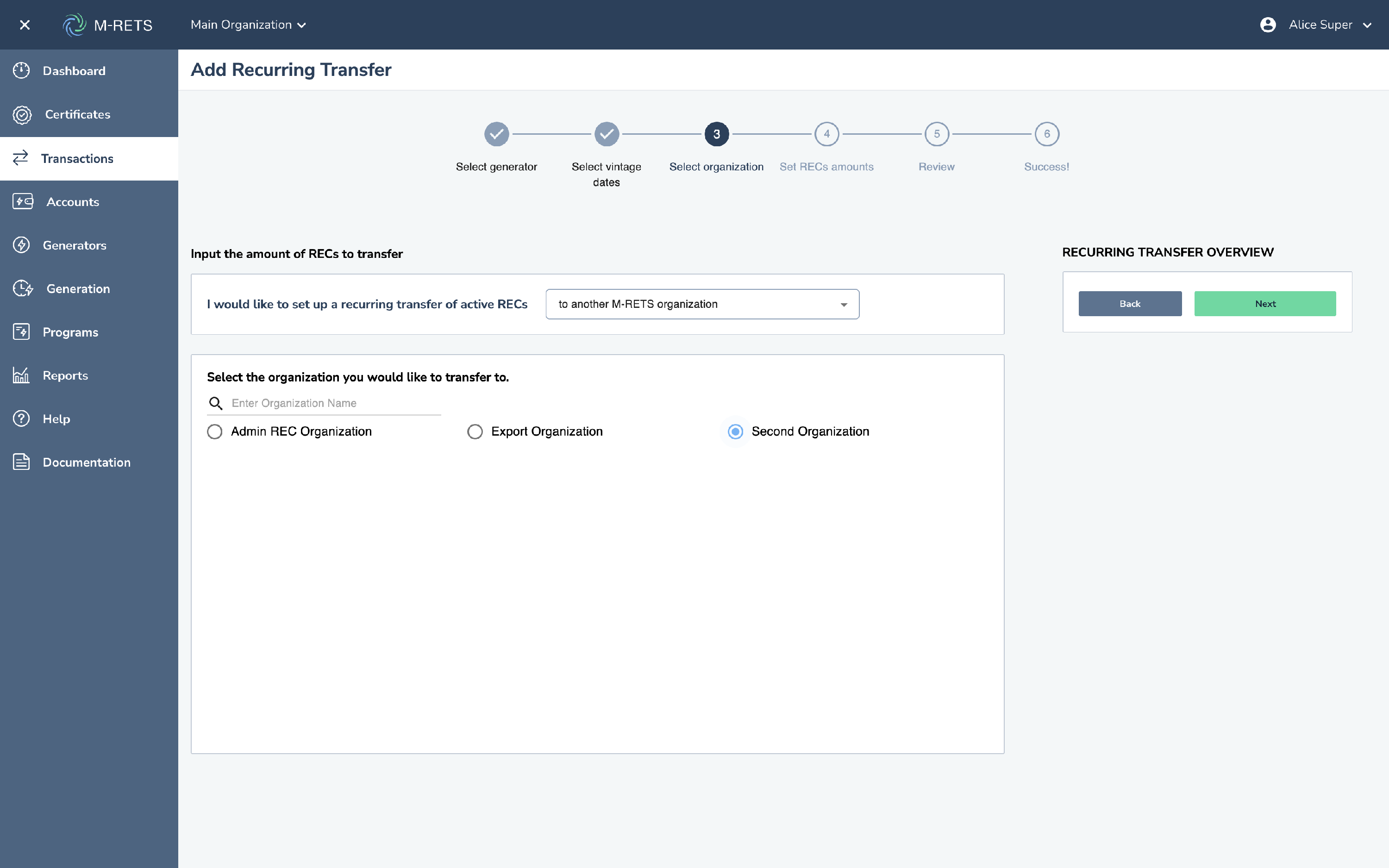 - The next page will determine where you would like the RECs to go. For this example, we are choosing "to another M-RETS organization". Please scroll to the next header for an Export.
