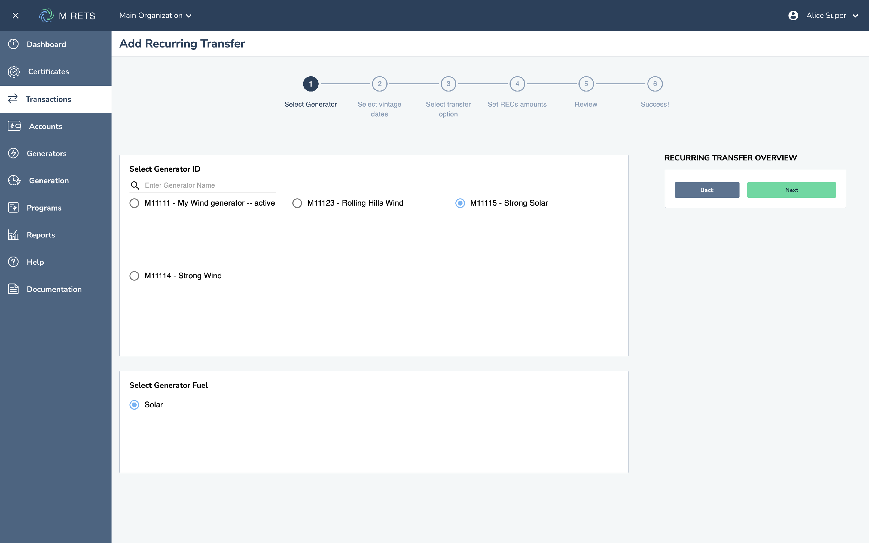 - If your project is a multi-fuel generator, select a fuel type for your transfer. For multi-fuel generators, the automatic recurring transfer will only pertain to one fuel type.