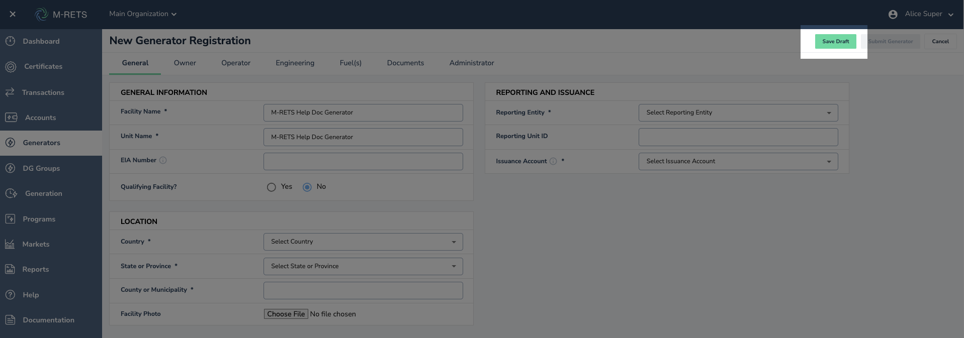 M-RETS requires documentation submitted by the registering organization in order to review generator registrations. Please do not submit a generator to pending status without the necessary documentation. Documents are uploaded under the documents tab of the generation registration. Select 'upload document' to perform a local search to upload your relevant documents.