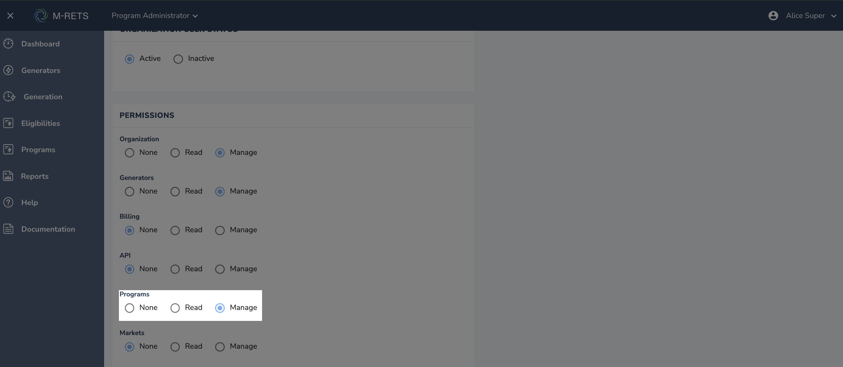 - Scroll down to Permissions and set "Program" to manage.
