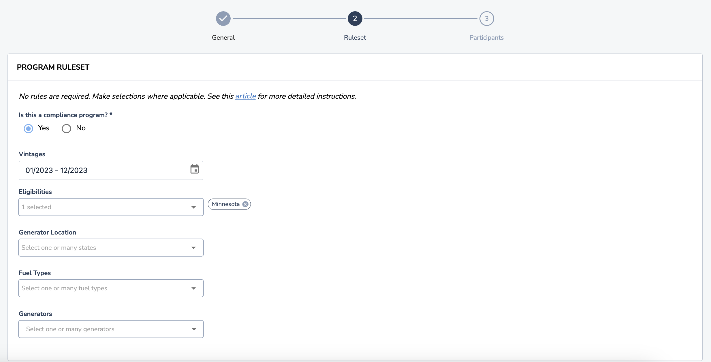 The Programs feature allows for the creation of specific criteria and eligibilities to be used in order for certificates to be retired. A Program Administrator invites participants to a program and can create eligibility requirements that must be met such as vintage, fuel source, generator location, eligibilities, etc. Programs can be set up for either voluntary or compliance use.