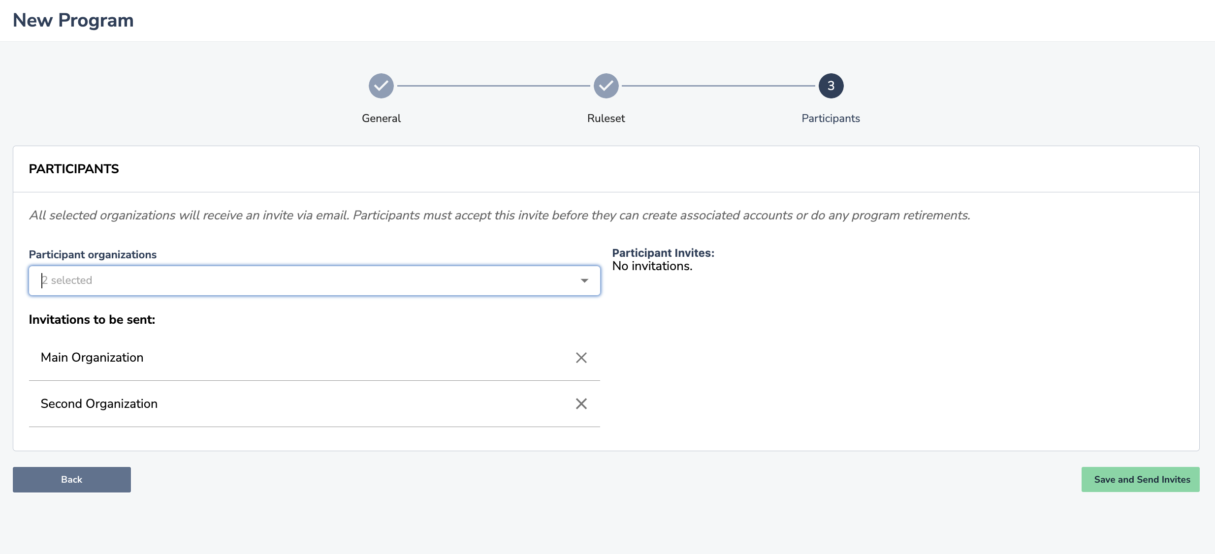 - Once you have selected organizations, select "Save and Send Invites". Your program is now created.
