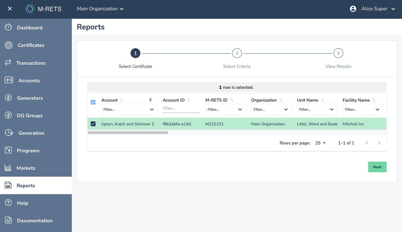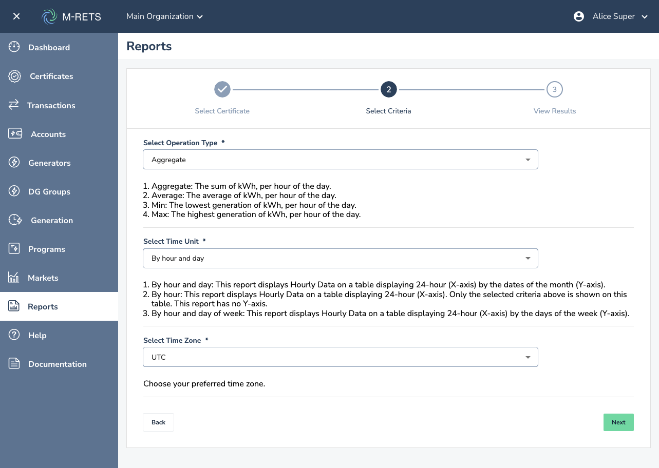 - The table displays all eligible hourly data. Certificate batches must be intact, or they will not be displayed here. Select the certificate batches for which you would like to run the report. If you select the same month from more than one generator, the resulting report will show a combined hourly value for all selected generators.