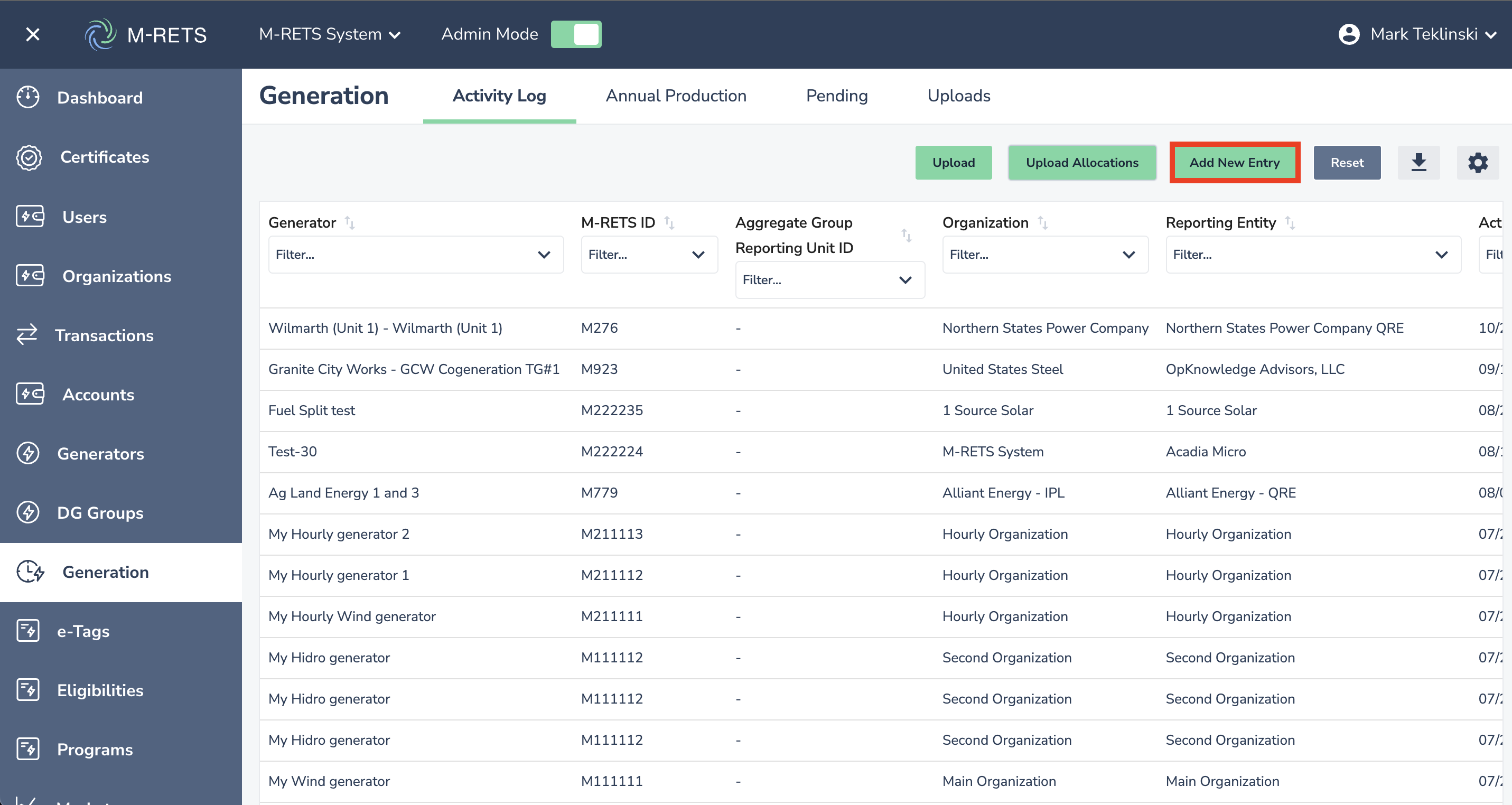 To upload generation for an Aggregated Meter Group select the "Add New Entry" button in the top right of the table