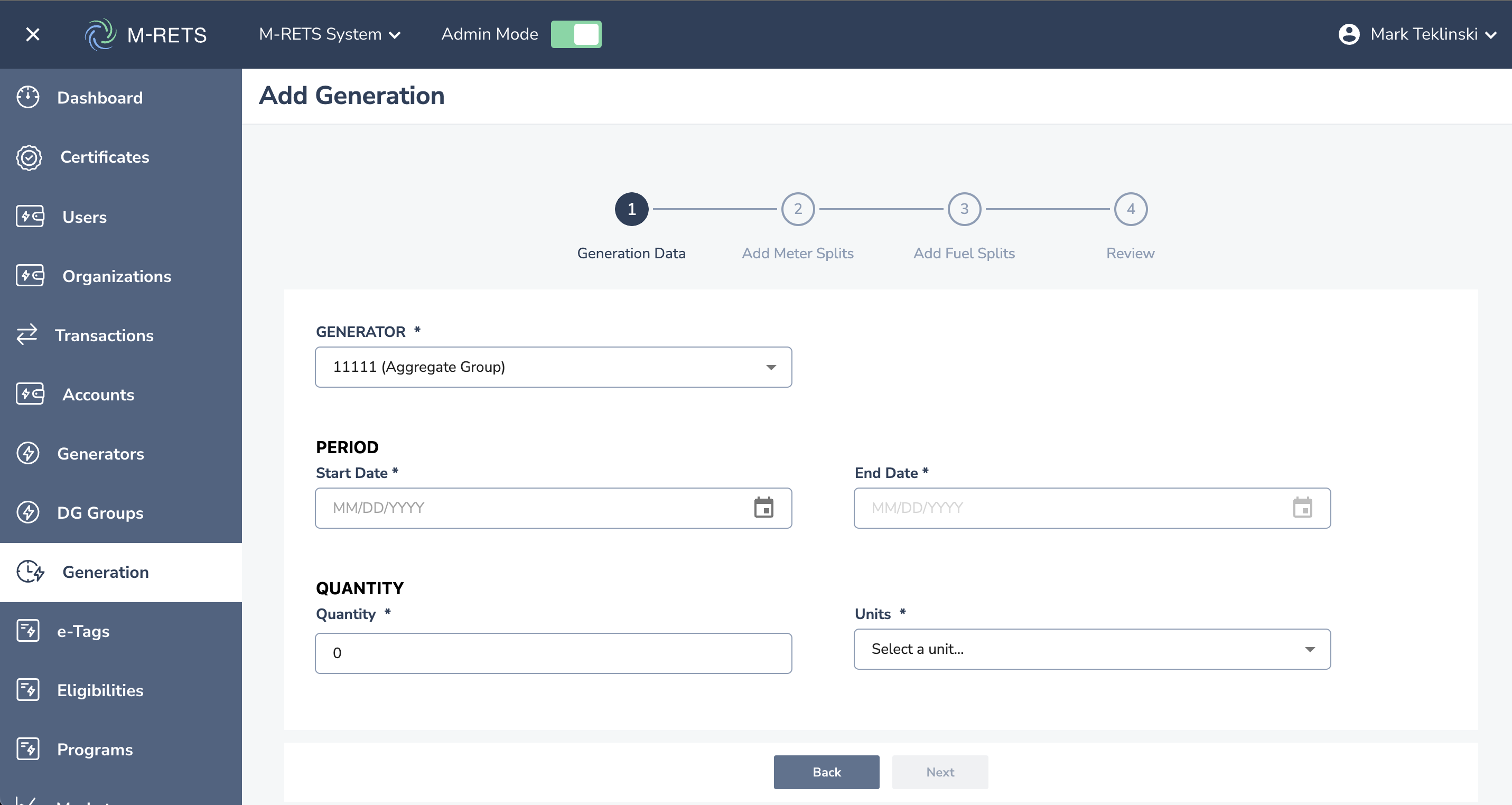Distributed Generation projects that would like to aggregate their generators should not use the Aggregate Meter Registration. M-RETS has developed Distributed Generation Groups to register multiple DG projects up to 1 MW. If you do not see the 'Distributed Generation Group' option in the vertical menu, contact the M-RETS Administrator [email protected]
