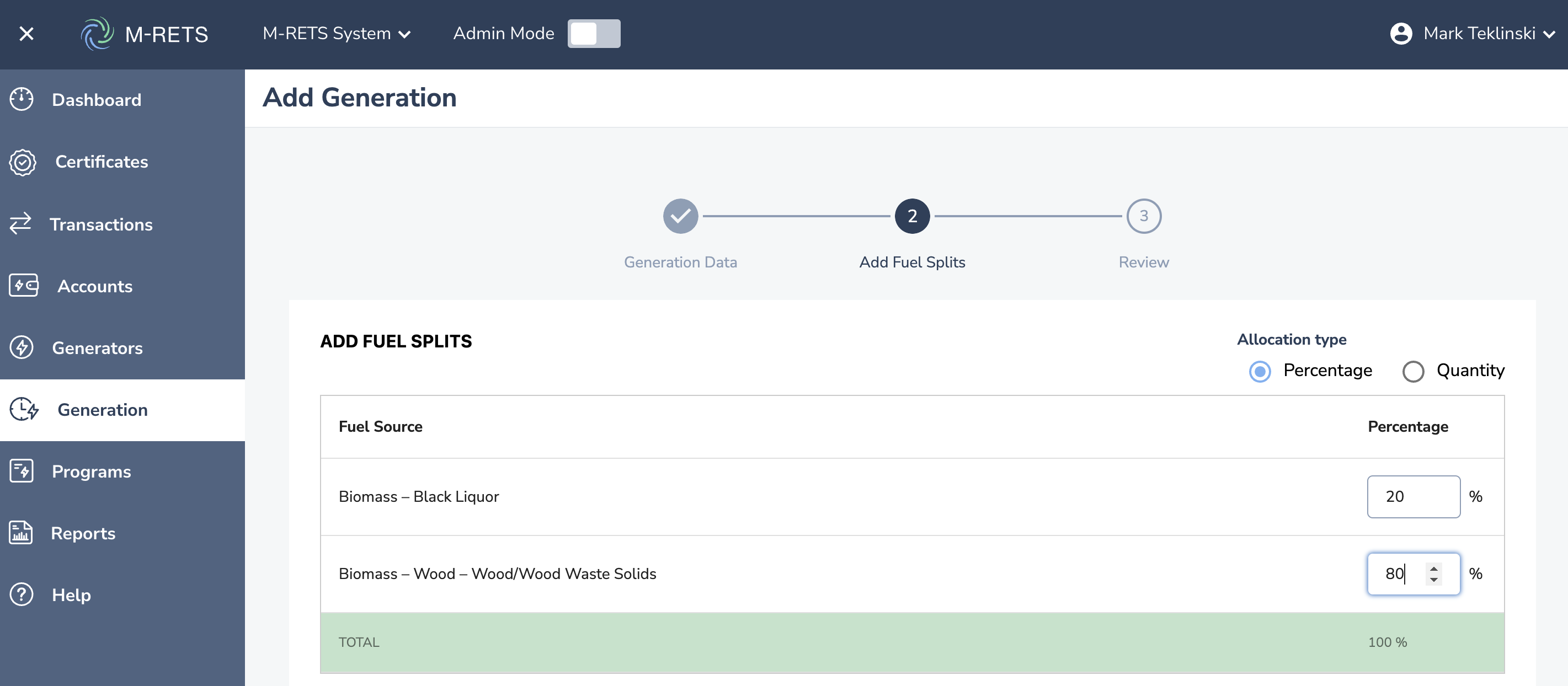 Step 2: Enter the fuel source split allocation(s) in the appropriate column. Splits can be either entered in by percentage or quantity. Once the allocations have been entered, select "Next"