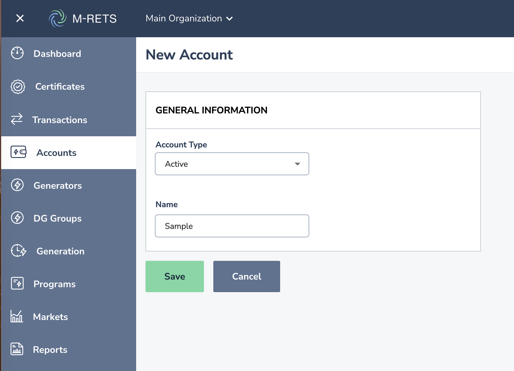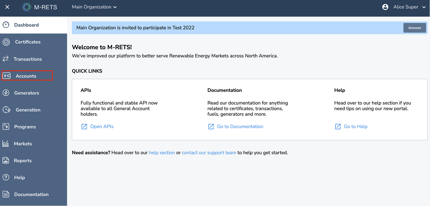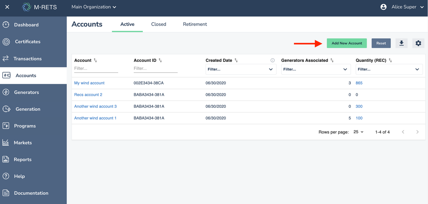 M-RETS supports three Account types: Active, Reserve, and Retirement Accounts. Users can transfer Certificates to specific Accounts manually or automatically upon upload. Each Account has a unique identification number, like a banking system. Users may attach aliases to Accounts for ease of reference (e.g., by state, by product name, etc.). The User can create an unlimited number of accounts for each type. Down below are steps to take to add a 'new account' for an Active, Reserve or Retirement account.