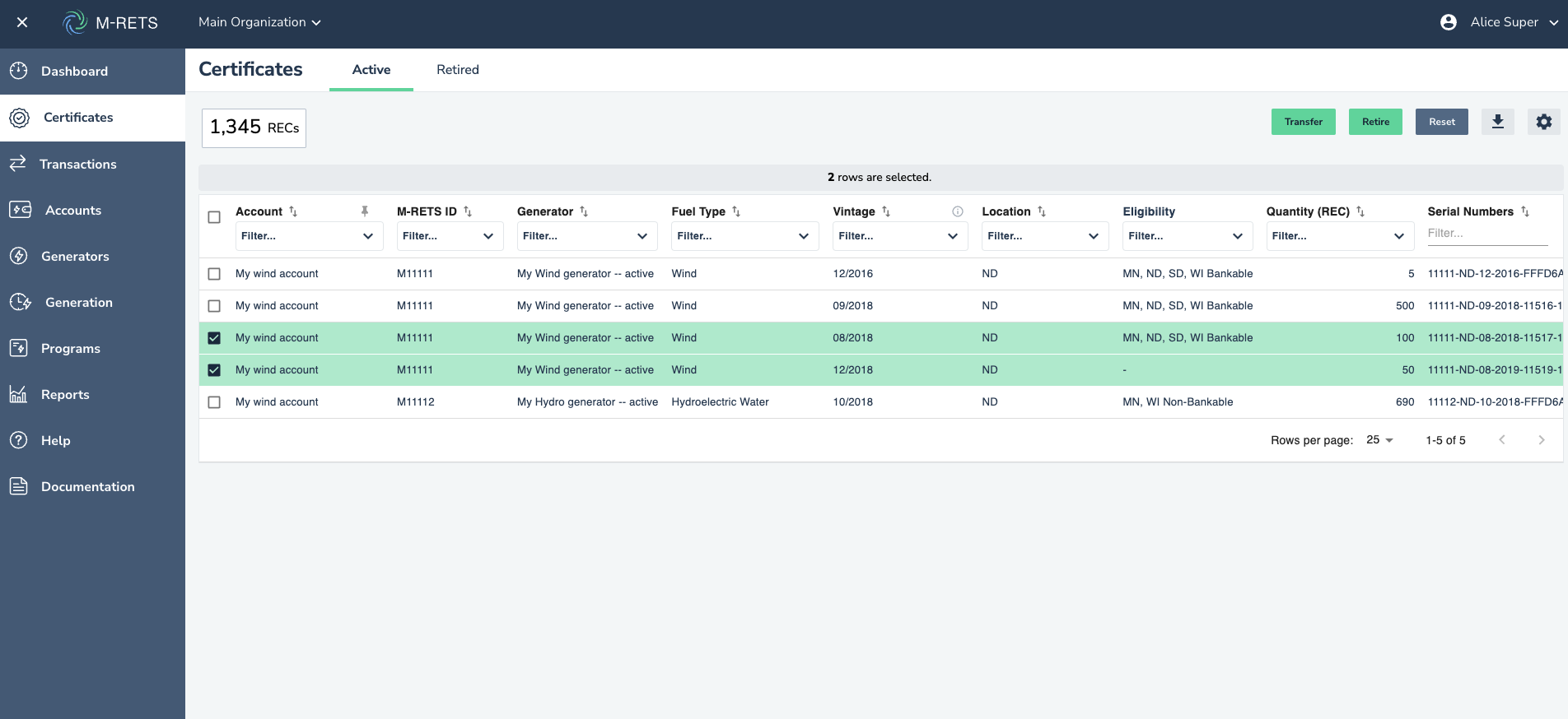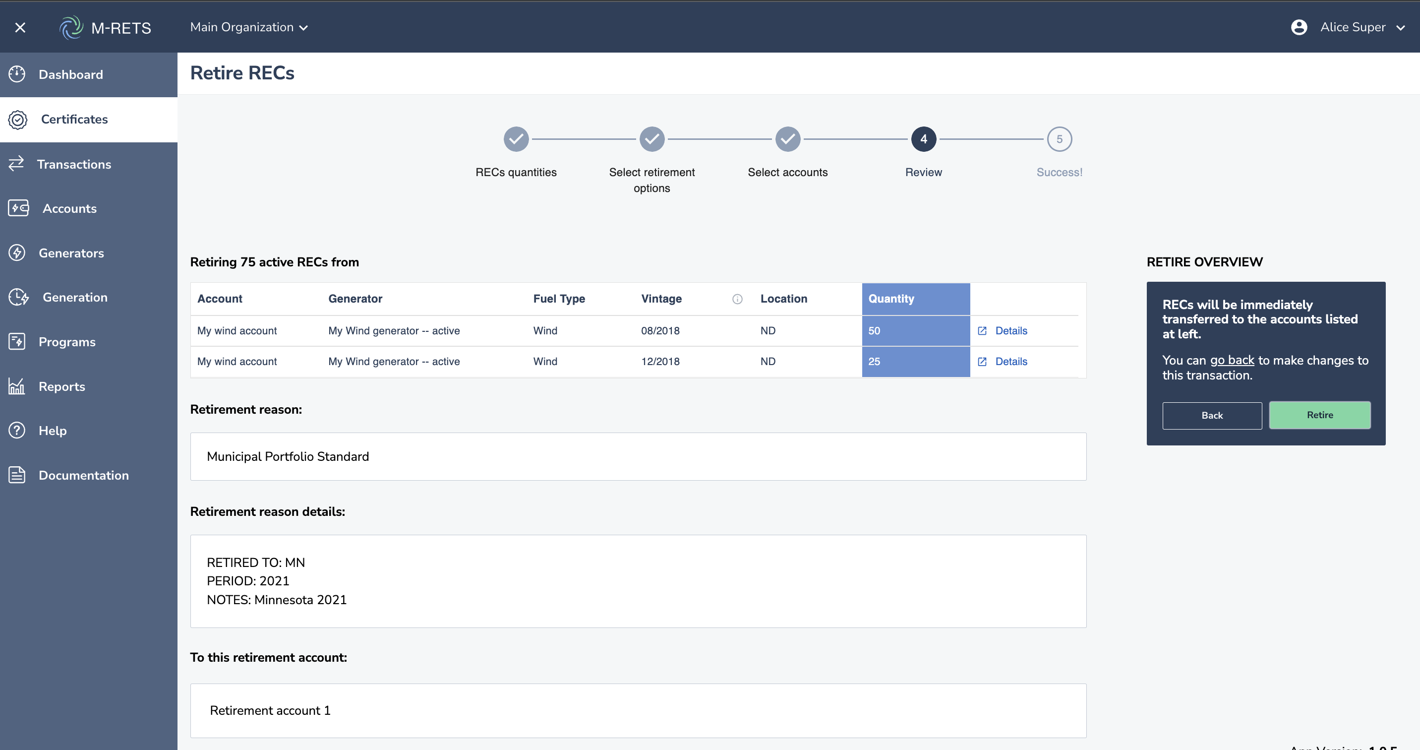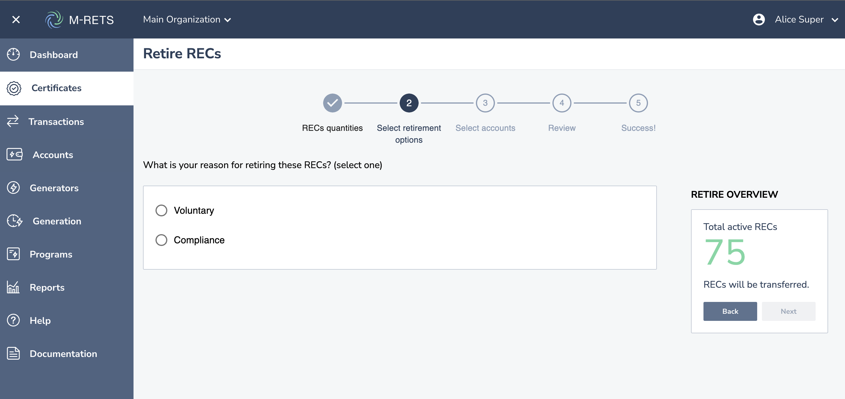 M-RETS does not determine whether Certificates should be retired for voluntary or compliance purposes. All Users are responsible for initiating and completing their own retirements.