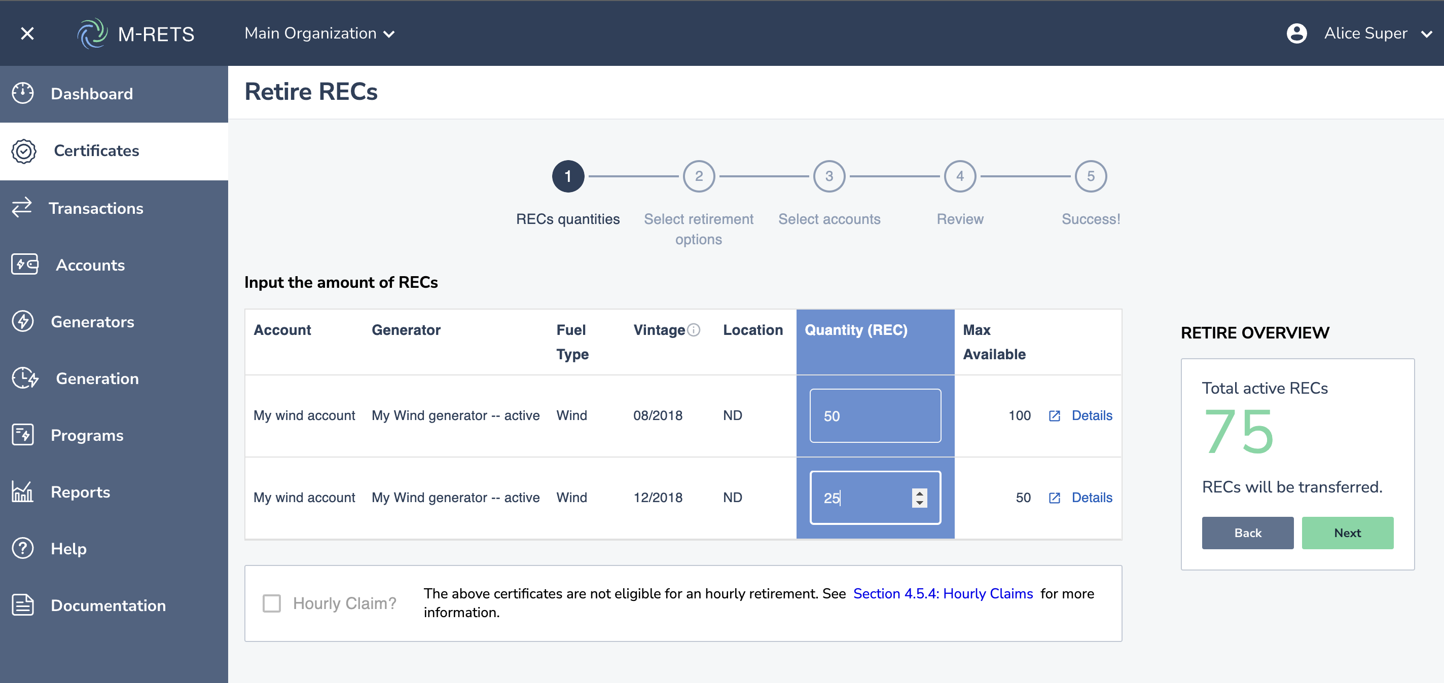 - On the first page of the retirement screen, you can change the amount of RECs you are retiring. For this example, we will retire 150 RECs, with 50 from the first batch and 25 from the second batch.