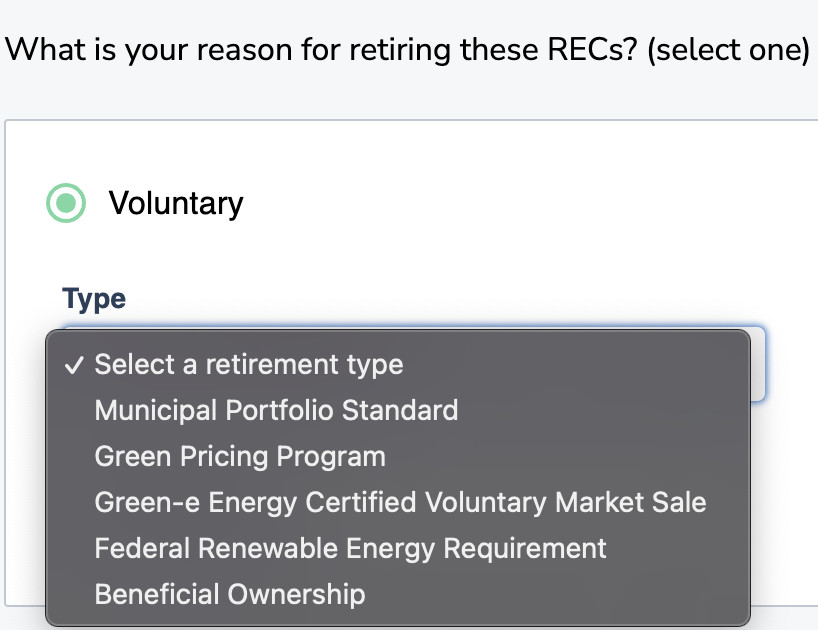 - On the second page of the retirement screen, enter the quantity of Certificates you wish to retire and select Next. You will then be prompted to choose a retirement reason. For detailed descriptions of each retirement reason, please refer here.