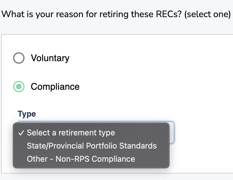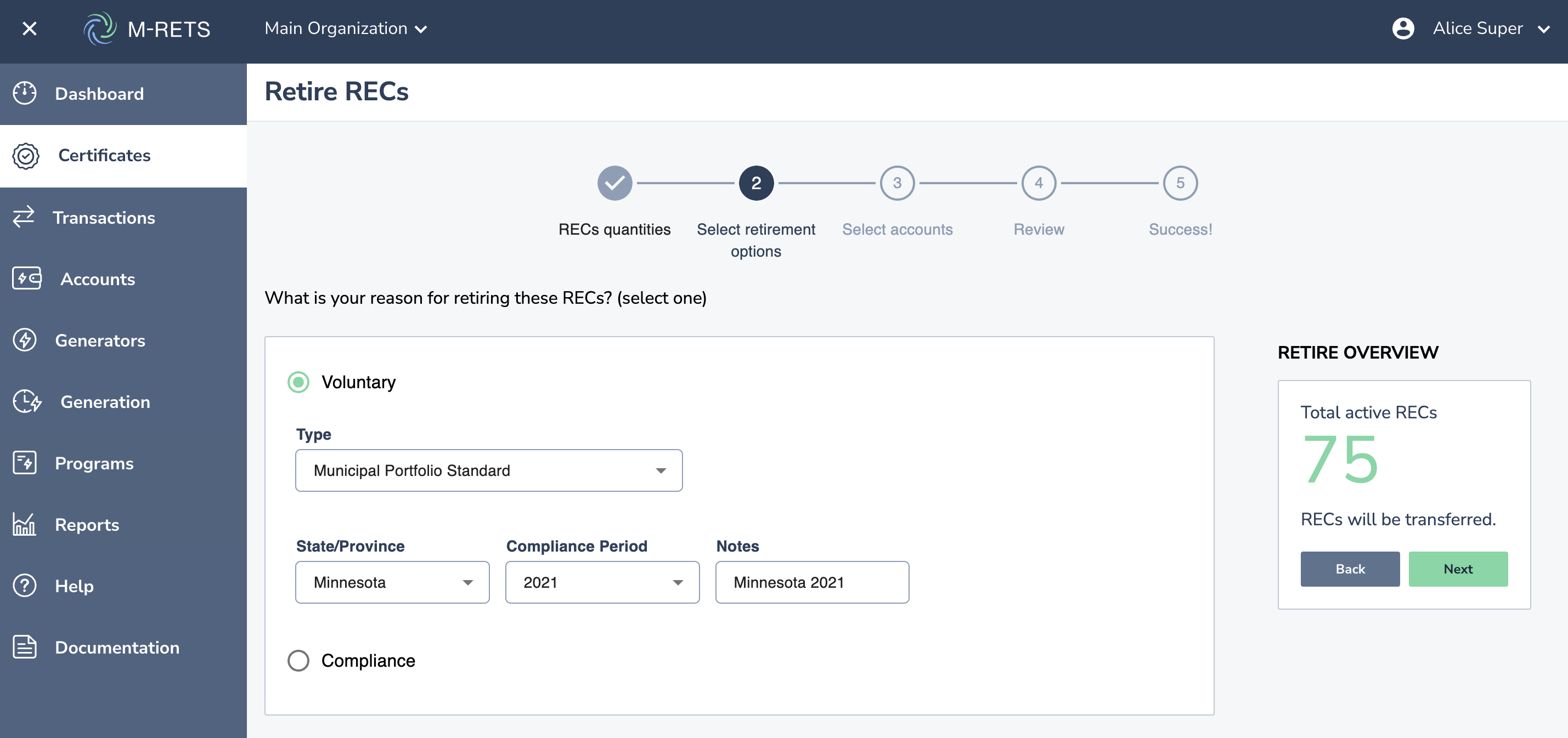 All Certificate retirement types allow the user to input notes that become a part of the retirement record in the database. For this example, we have chosen a Voluntary State RPS retirement for Minnesota for 2021.