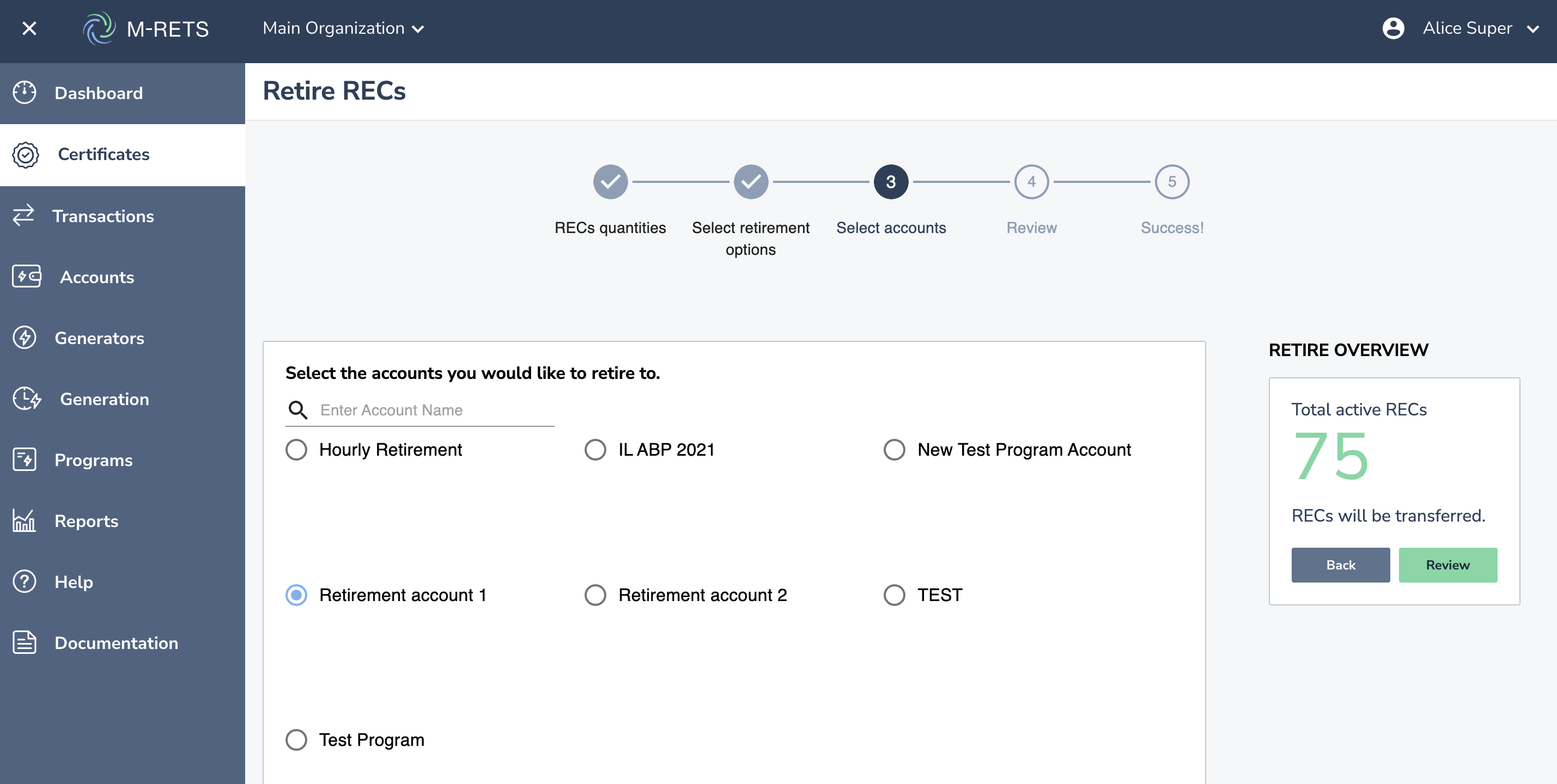 A Retirement Account is used to hold M-RETS Certificates that an Organization has chosen to retire for an environmental claim. Once Certificates are placed in a Retirement Account, they cannot be transferred and function as the official electronic record of retirement.