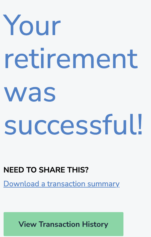 Upon completion, you will see a confirmation screen that your retirement was successful. Here you can also select View Transaction History to download a retirement record document.