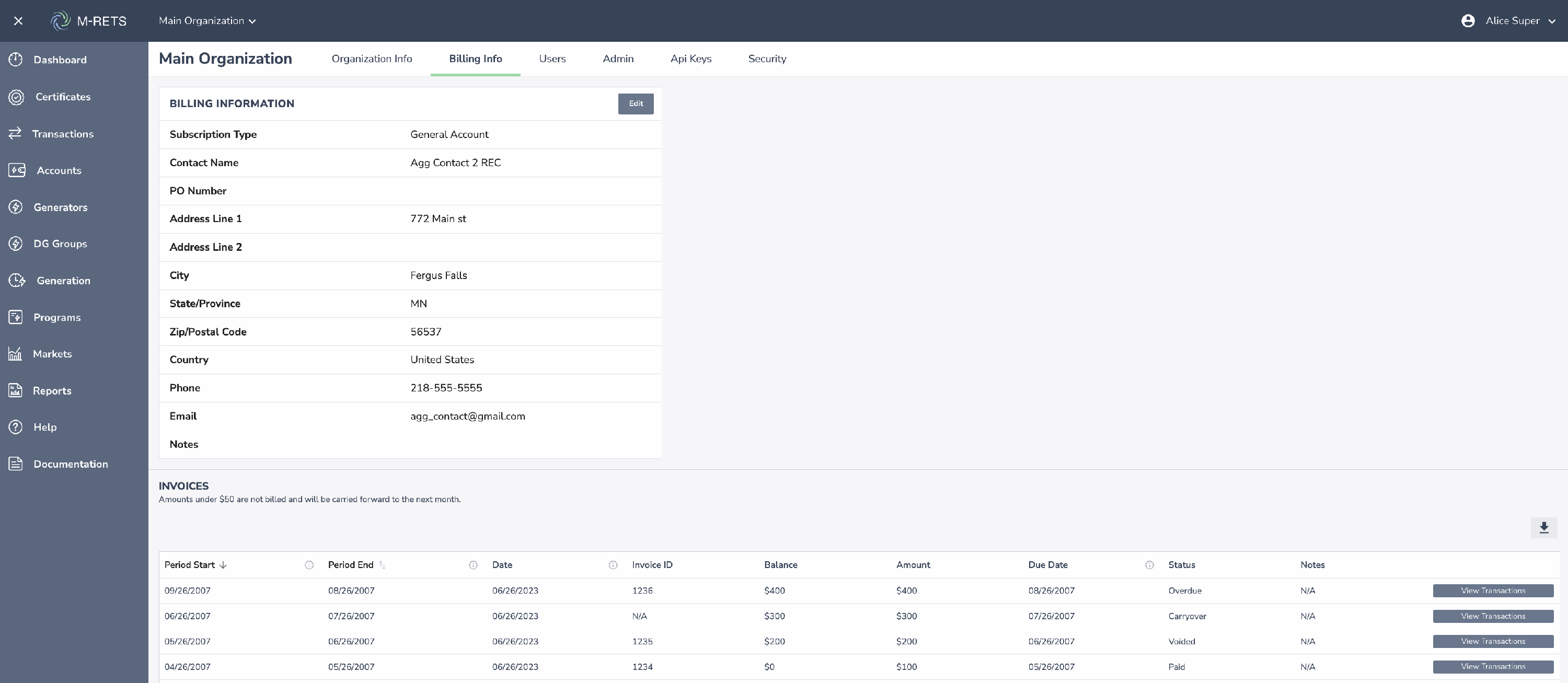 - You can view the status of your invoice(s), by selecting 'View Transactions', the system will display the billable transactions (issuance, retirements, reserve, exports, and imports) conducted during the billing period.