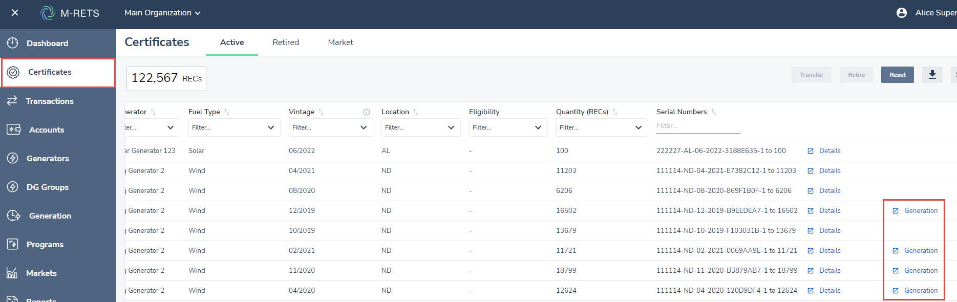 Select the Certificates dashboard button from the vertical Dashboard menu. The "Generation" link will be displayed for any certificates with hourly data