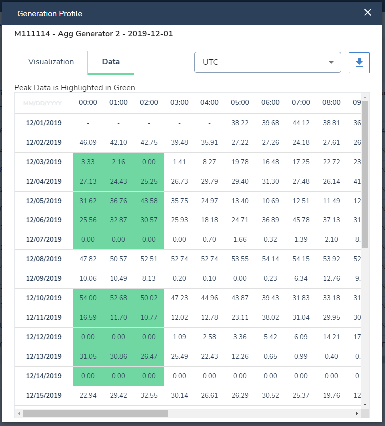 The Generation Profile's Data tab will display the hourly generation data in a table. OnPeak data will be displayed in green. The user can download the data into PDF or CSV format using the download button (Arrow Icon)